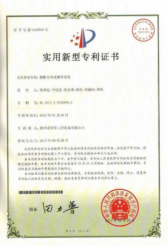 創(chuàng)華工控“微糖分在線測量系統(tǒng)”喜獲國家專利