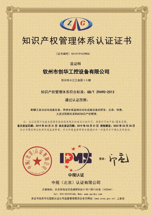 欽州市創(chuàng)華工控設(shè)備有限公司于2019年3月31日通過知識產(chǎn)權(quán)管理體系認證,獲得了《知識產(chǎn)權(quán)管理系統(tǒng)認證證書》。